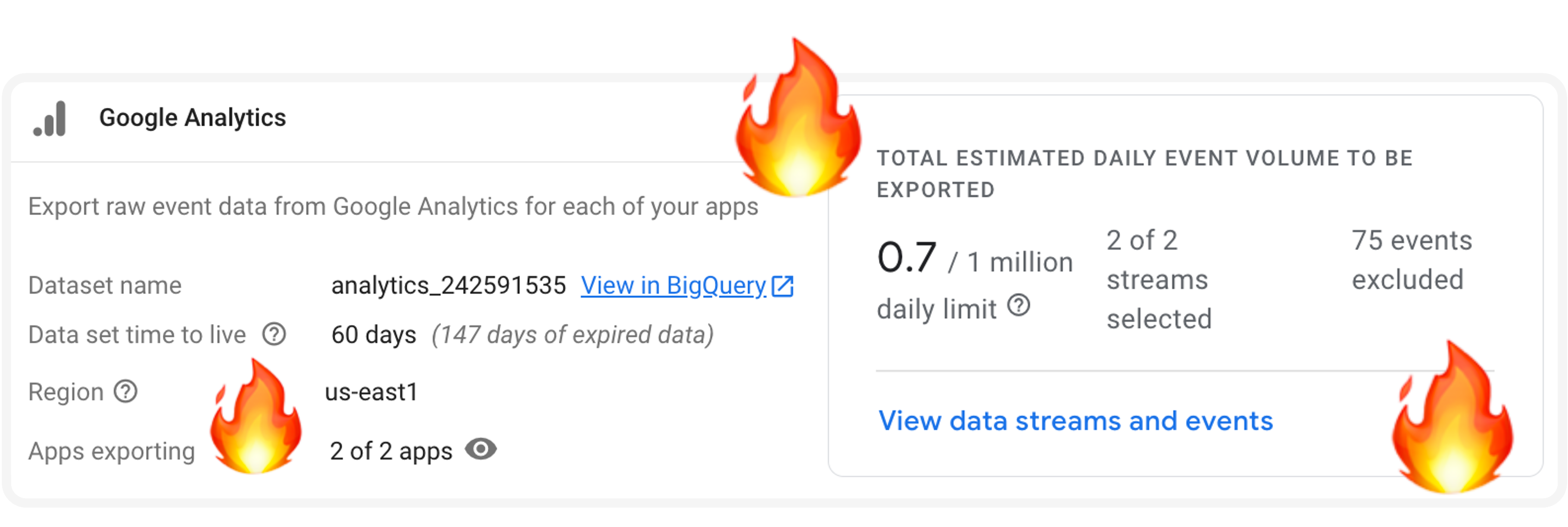 With a smart approach to event setup and limited export to the most relevant event types, this quota can go a long way, even for medium-sized apps. However, beware of additional charges you may incur on the BigQuery side.
