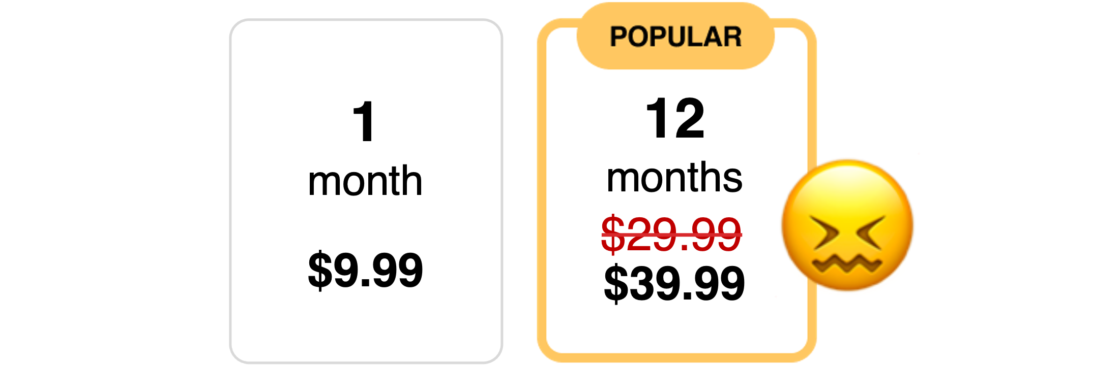 If you run price experiments or experiments with different paid packages (e.g., monthly/yearly subscriptions vs. weekly/quarterly), there is a good chance that some of your users will see different offers at different points in time. This can sometimes lead to users’ confusion or even frustration.